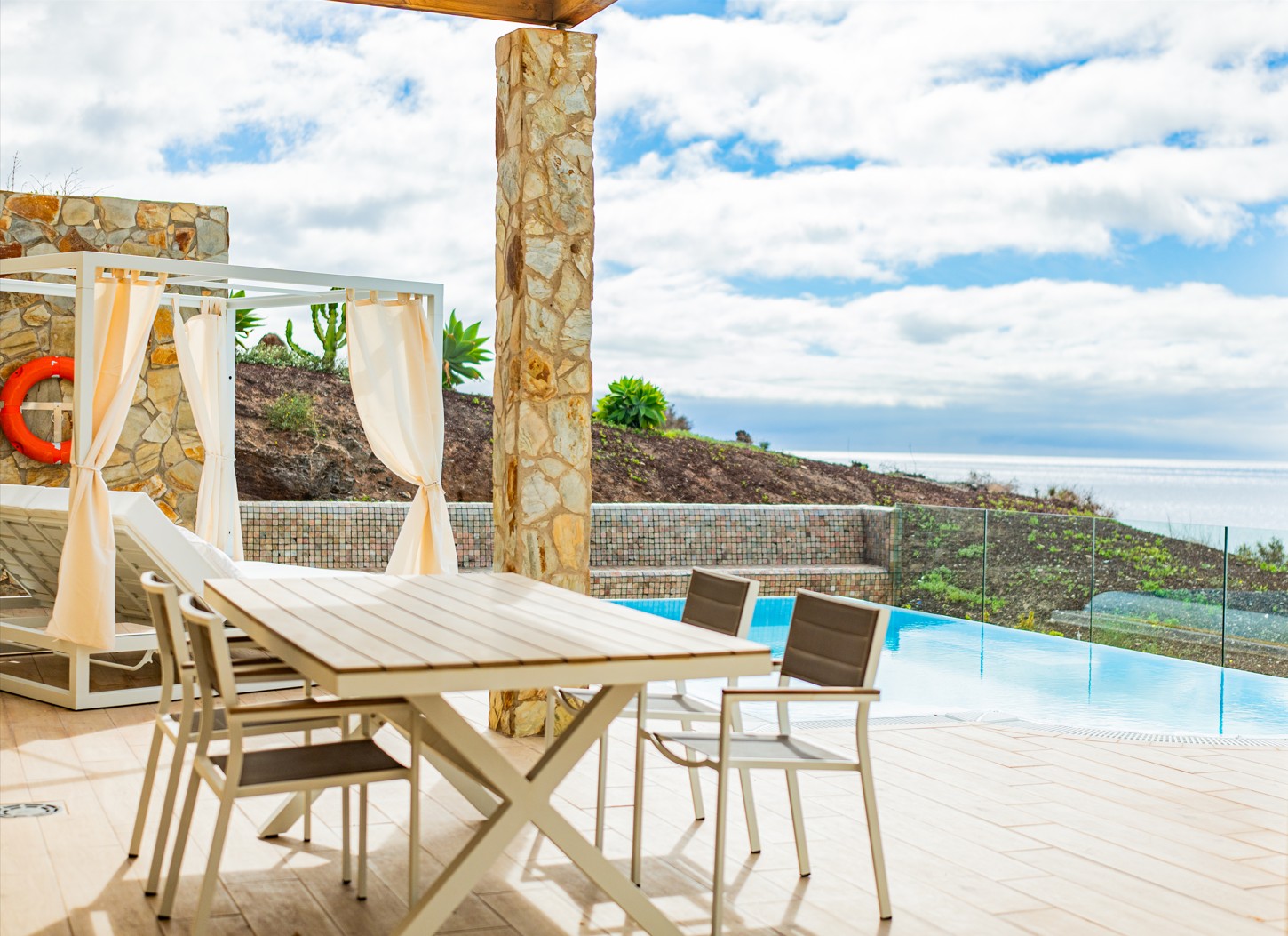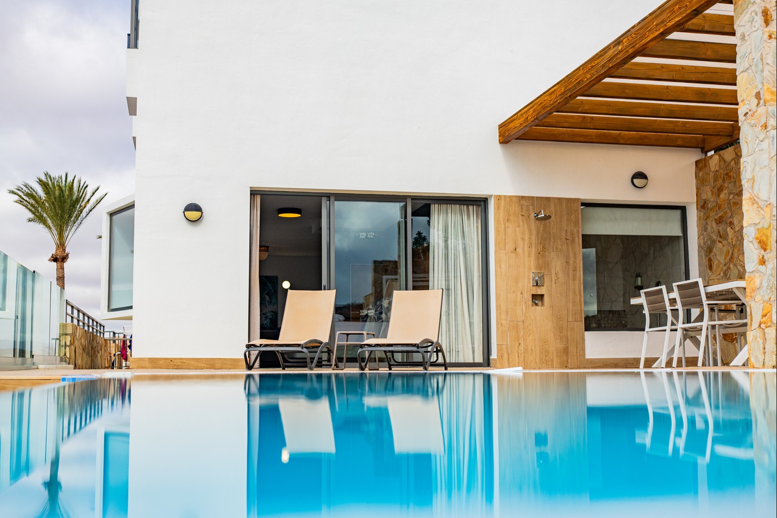 The suites with private pool are 76m² large so you will have enough space to relax. Enjoy the beautiful view over the ocean from the 55m² terrace and 22.5m² heatable pool. The suites can be booked either for two or for three people.